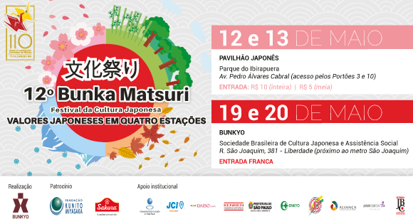 Nos dias 12, 13, 19 e 20 de maio, São Paulo receberá o já tradicional Bunka Matsuri – a Festa da Cultura Japonesa, que chega à sua 12ª edição. O Bunka Matsuri oferece diversas atividades entre exposições, oficinas, palestras, shows e workshops relacionados à dança, música, artes plásticas, gastronomia e outros aspectos da cultura japonesa, que serão realizadas no Pavilhão Japonês, no Parque do Ibirapuera, e no Edifício Bunkyo – Sede da Sociedade Brasileira de Cultura Japonesa –, na Liberdade.